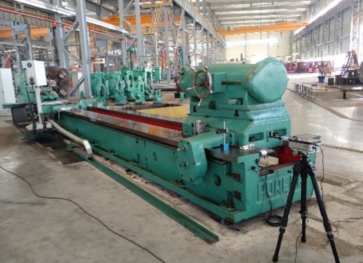 Un torno horizontal, fabricado en Polonia hace muchos años, se encarga principalmente del mecanizado de piezas de gran tamaño para equipos hidroeléctricos. La máquina herramienta está accionada por un motor de corriente alterna y cuenta con una bancada de dos estructuras de rieles, así como un portaherramientas de cuatro capas.